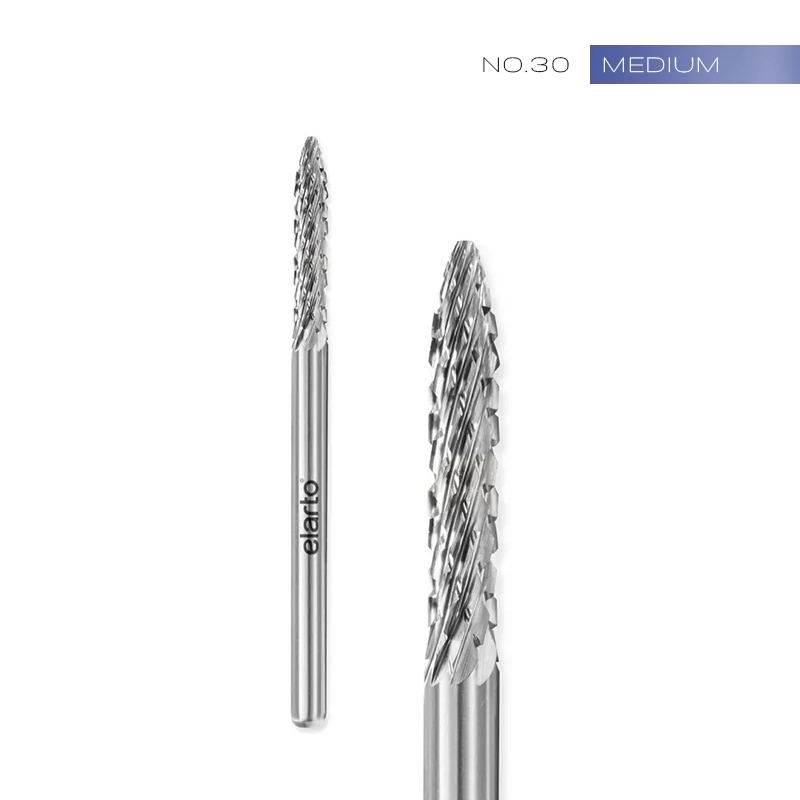 Frez Elarto No30 z węglika wolframu to długi, wąski, zaokrąglony stożek – narzędzie doskonałej jakości i długiej żywotności. Umożliwia szybką i bezpieczną pracę podczas zabiegów manicure.